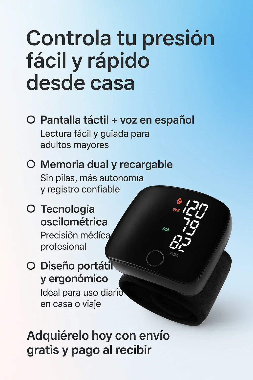 🗣️ Voz en español: el dispositivo habla y explica los resultados, ideal para quienes tienen dificultad visual o auditiva.